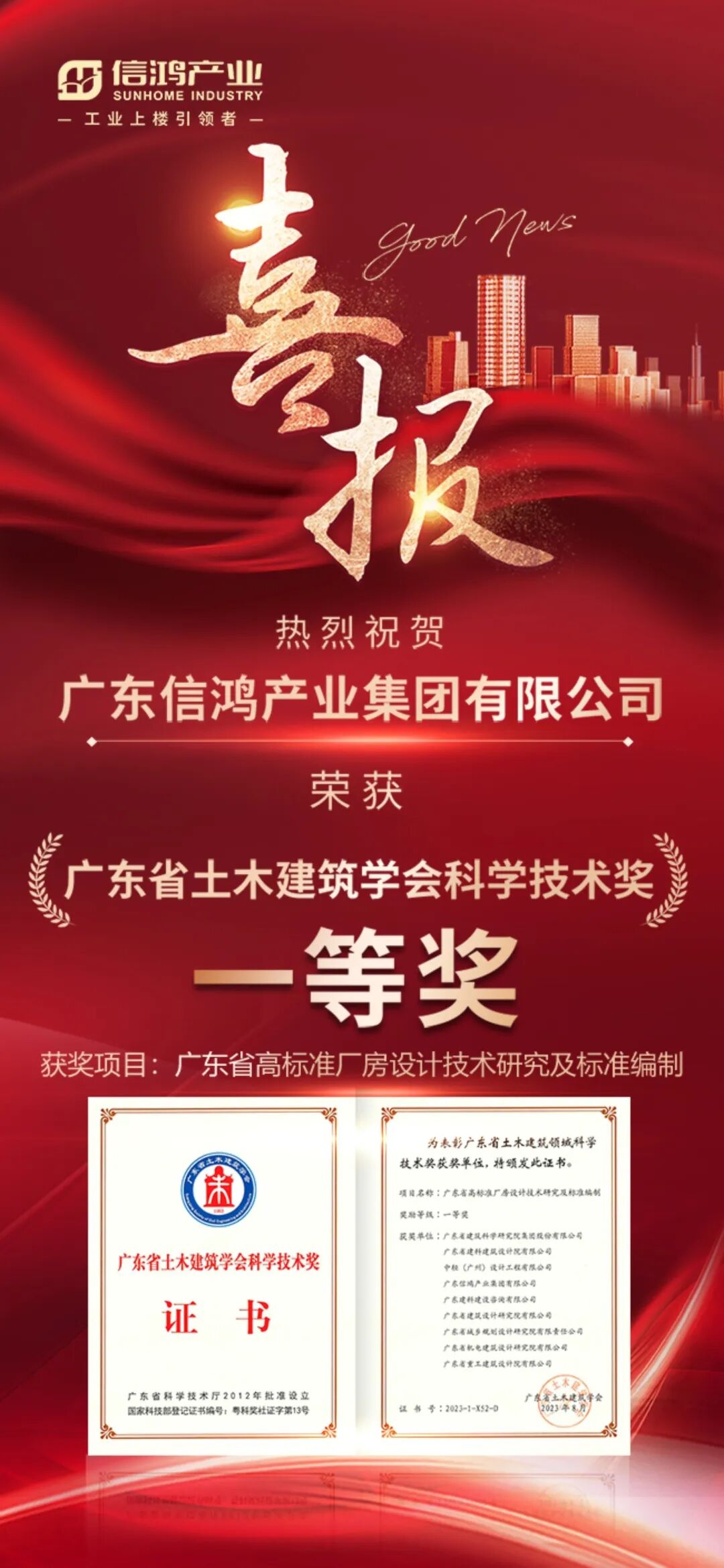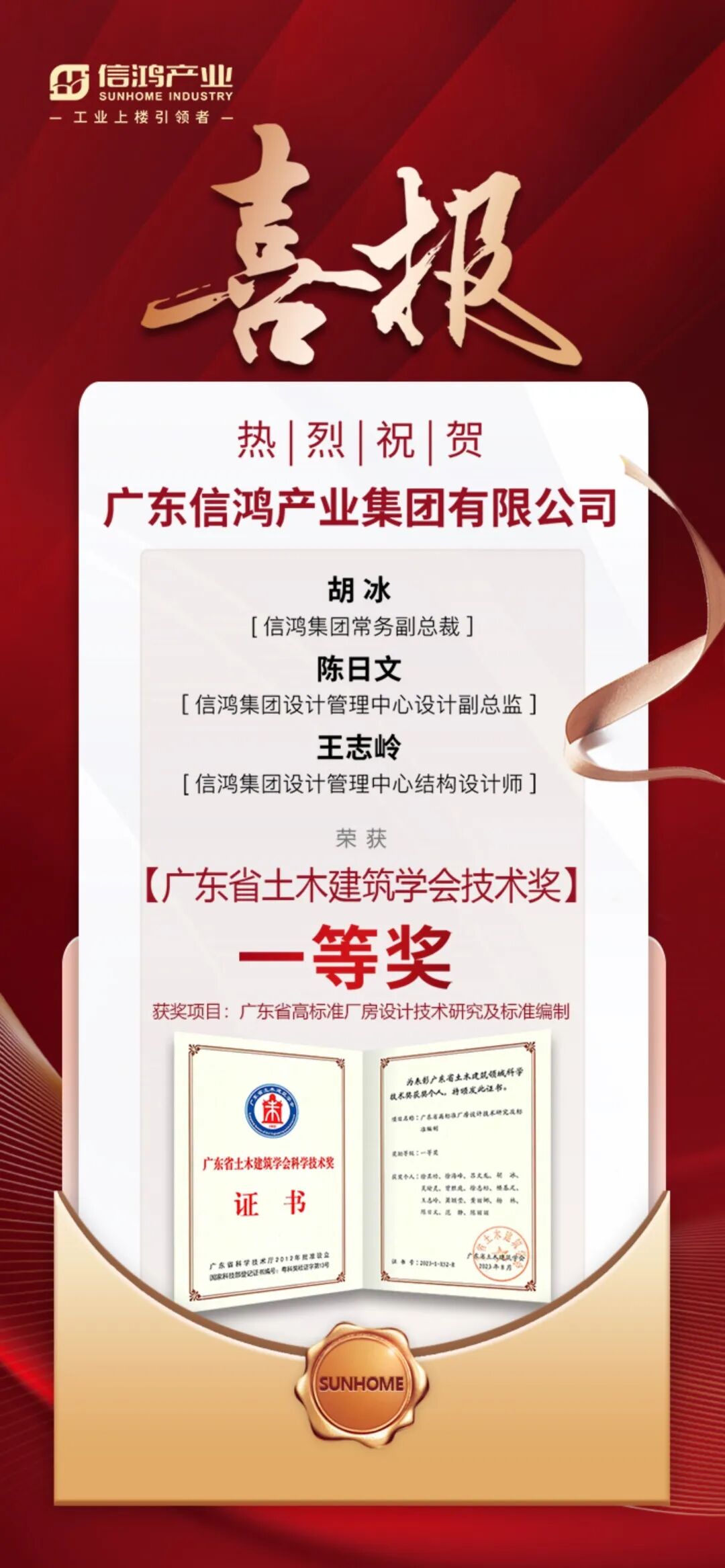 近日,2023年(第十一届)广东省土木建筑学会科学技术奖获奖项目名单公布,经过申报、初审、网评、答辩、终评和公示等环节,信鸿产业集团获得广东省土木建筑学会科学技术奖一等奖,同时信鸿集团常务副总裁胡冰、设计管理中心设计副总监陈日文、设计管理中心结构设计师王志玲获得广东省土木建筑学会技术奖一等奖。